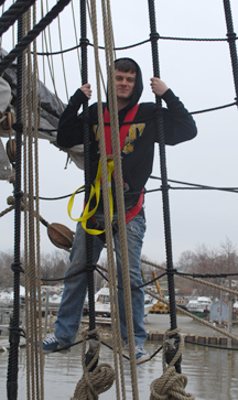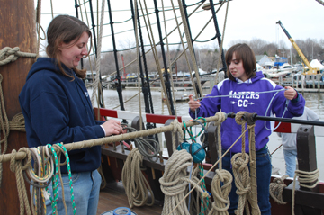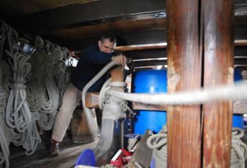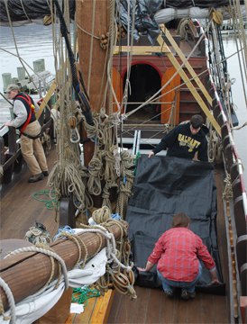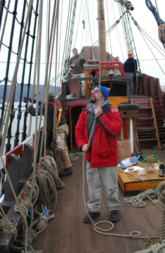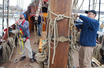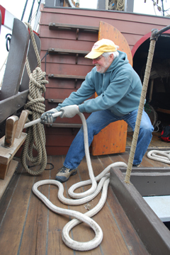 William Gordon coils the main yard lines as they find their homes on the pin rail.