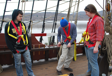 The safety harnesses and lanyards we use on the Half Moon are now in full compliance with OSHA (Occupational Safety and Health Administration) standards. OSHA regulations don't actually apply to maritime use, but we've decided to upgrade anyway, literally, just to be safe.