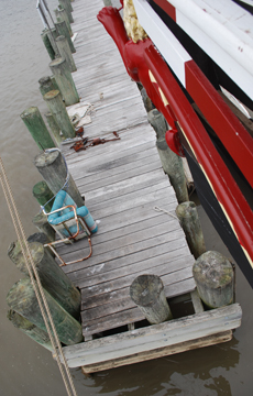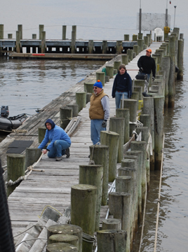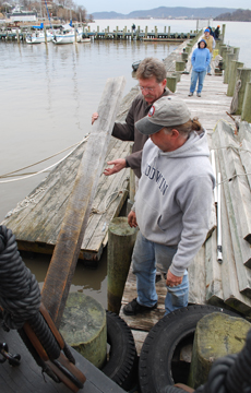 As the Half Moon pivots, its full weight may come to rest on a single point at the edge of the dock. A serious concern arising from this is preventing any of the "chains" (rigid metal chains beneath the channels, to which the shrouds are fastened) from snagging on the pilings. Greg Weiss and Woody Woodworth use their own form of leverage to gird the ship against any such damage.