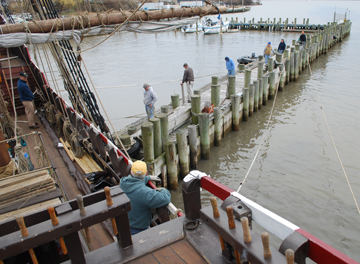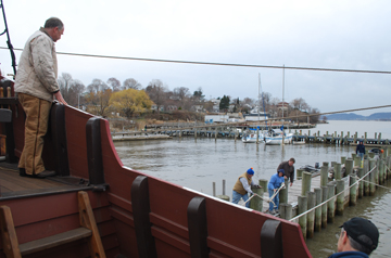 The present crew rises and takes advantage of the flood tide to move the Half Moon down the dock, toward the mouth of the breakwater.