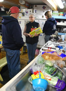 Belowdecks, Bonnie Talluto is busy organizing the galley and stowing food. She predicts that dinner will be ready in an hour...
