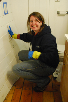 With a contingent of crew members still on their way, we haven't yet established an official crew rotation. Until the duty roster is prepared, Carolyn Niehaus keeps the systems running by performing maintenance duty in the head.