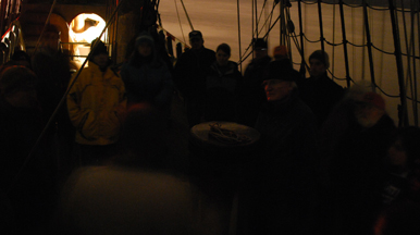 Yet another wave of crew members arrive after dark, the last of our dockside assistants leaving in their wake. With just a few crew members still absent (and scheduled to arrive first thing tomorrow morning), Captain Reynolds convenes all hands on the weather deck for a welcome to the latecomers and a basic briefing for all.