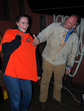 We conclude our evening by wrapping up a loose thread from 2010. Last year, we awarded our core volunteer base with embroidered "dress" crew shirts to thank them for their service. Sadly, Rachel Laufer, who served on board as bosun's mate throughout the 2009 season, was away at school, denying us the opportunity to present her with her shirt. Captain Reynolds is delighted to present it to her now that it's long overdue! You can see more of our senior crew receiving their dress shirts during this voyage on the Crew page.