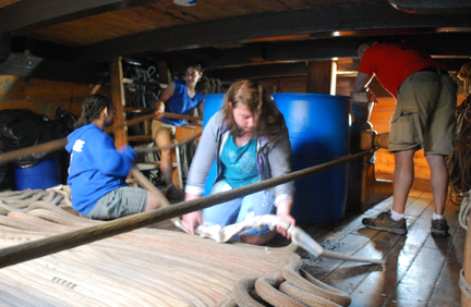 At the bow, Ms. Read is tending the bits, ready to make fast the rode (lash it to the bar) at any moment as a safety precaution. Lydia and Hannah are faking, and Mr. Roy is observing the rode as it enters the ship.
