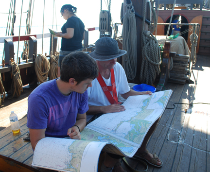 Mr. Shoemaker and Mr. de Jong sit on the main cargo hatch and use the modern nautical charts we've set out to familiarize themselves with the region. As we noted before, the northern coastline of Long Island Sound is home to many hidden hazards.