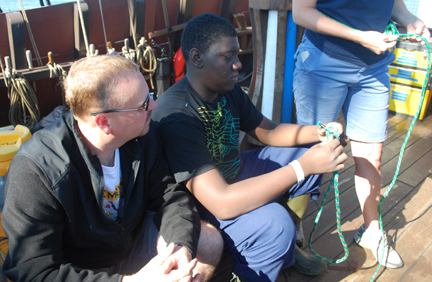 Kelsey has moved on to teaching his fellow crew mates how to use a bowline knot to create a rescue line.