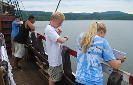 On this voyage, the research team of Hayley, Jason, and Morgan studied current speed and height of tide for their research project on tidal patterns, collecting their data while the ship remained docked at Constitution Island. Our position proved problematic, however, since unseen eddies and inconstant currents would sometime draw our current marker straight away from the ship, often resulting in the marker never crossing the "finish line." Whether these currents are caused in part by nearby World's End, the deepest point on the Hudson River, we cannot say.