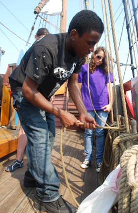 The Half Moon is a sailing vessel rigged with nearly three miles of line, and each line has a specific purpose. (All ropes on board sailing vessels are called "lines" once assigned a specific function.) Thus, line handling is one of the most basic, and most crucial, skills any sailor can learn (thus the saying, "learning the ropes").