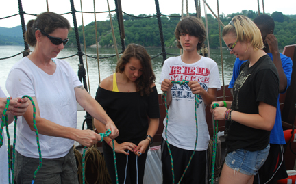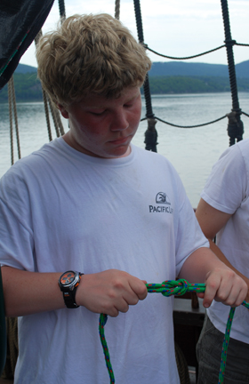 Students also learn a few basic knots, such as the square knot (pictured, left), the half hitch, and the bowline. Students can then use these combined skills as a foundation to master more advanced tasks, such as handling the sails or the art of marlinspike.