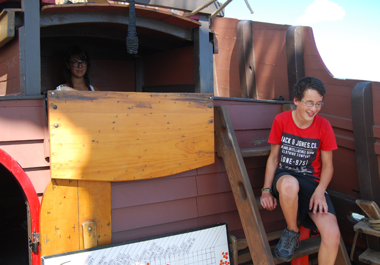 4th Entry, 1444 Hours: We'll go through an entire watch rotation during the day's sail. Each hour, new students step into the helm hutch to take control of the ship's steering. At the moment, Jelle is keeping Jessica company as she rounds out her hour at the whipstaff.