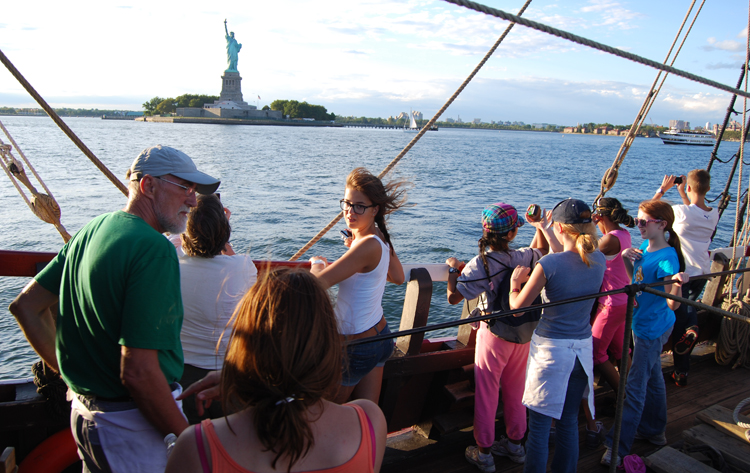 4th Entry, 1833 Hours: Our new sailors cluster at the starboard rail to take in the view of the Statue of Liberty. We've left the Hudson River behind now, and jave joined the bustling traffic of New York Harbor.