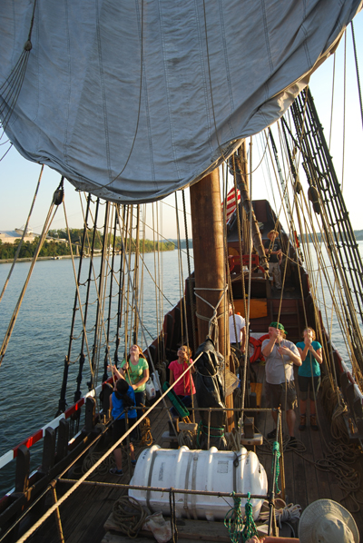 4th Entry, 1836 Hours: Sadly, our sail doesn't last long before the winds die, but we'll get another chance before long. Mr. Prime leads his main mast team through the steps of dousing the main course.