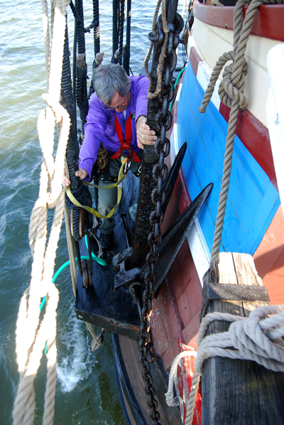 1st Entry, 1009 Hours: Mr. Lyke is stationed on the starboard channel, just below the foredeck team. He completes the process of weighing anchor by guiding the 400-lb. anchor onto the channel and safely securing it. Once the anchor is secure, the anchor light is down, and the anchor rode is reset, we're ready to go. Today's journey will take the Half Moon up the Lange Rack -- the Long Reach.