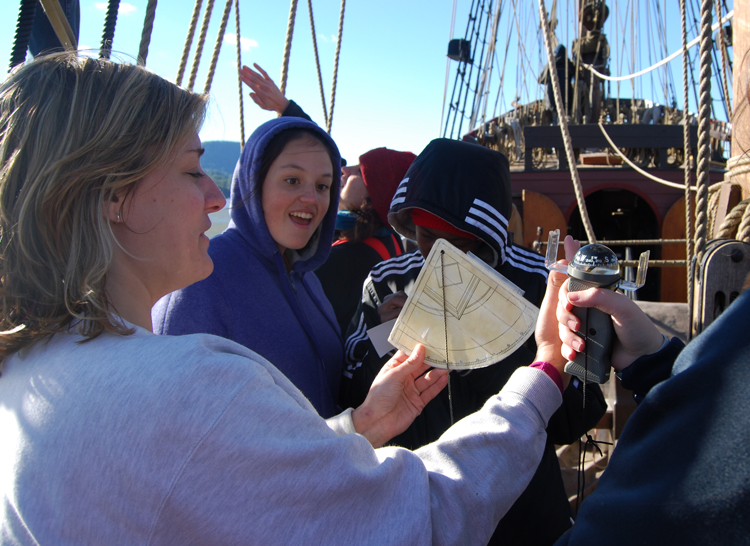 We use a traditional instrument called a quadrant (pictured) to measure the angle of celestial objects above the horizon. Captain Hudson himself would have used this instrument to determine his latitude (his position on the north-south axis of the globe). The quadrant is so named because it forms one quarter of a circle (a 90˚ angle). 0˚ represents the equator, while 90˚ represents the north pole. Gravity pulls the dangling plumb bob straight down toward the center of the Earth. A navigator in the northern hemisphere can look up along the quadrant's flat edge to observe Polaris, the north star; the resulting angle indicated by the plumb bob would then indicate the user's northern latitude. (These same measurements are used to record the ship's track throughout the voyage today.)