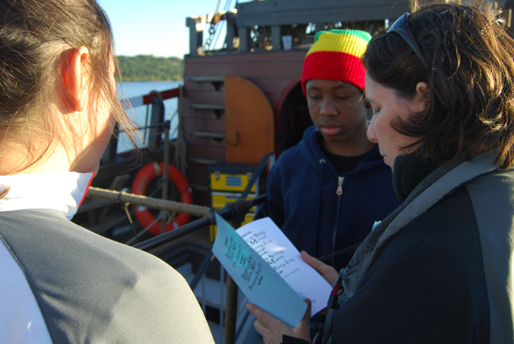 The Crew Rating Log is a 12-page booklet printed in both English and Dutch (English on the right-hand pages, Dutch on the left). Inside, it presents questions and tasks in four categories: Crew Safety (Veiligheid), Arts of the Sailor (Zeemanskunsten), Half Moon History (Halve Maen Geschiedrenis), and Ship Operations (Scheepshandelingen). When a crew member (be they student or senior crew) feels they can demonstrate proficiency with all the challenges listed on a page, they can approach the captain for an official review. If they pass muster, they receive an official stamp and signature and therefore qualifty for the rank assigned to that page.