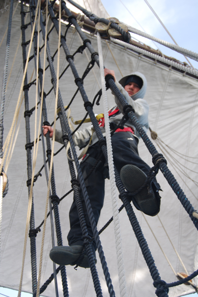 Students also learn the importance of maintaining three points of contact, a climbing technique which ensures that if one limb (either a hand or foot) ever does lose its grip on the rigging, climbers still have at least two more supporting them at all times.