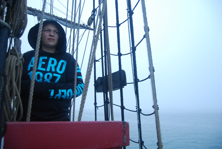 Lookout: The student stands at the fore mast on the foredeck, scanning the waterway ahead for traffic and potential hazards, calling back what they see to the Quarter deck. This is necessary because, due to the method of construction of 17th century vessels, the Quarter deck officers' view directly ahead of the ship is obstructed by the foredeck itself.
