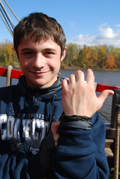 Under Mr. Hottenstein's tutelage, students on this leg of the Voyage of Discovery enjoyed learning how to make bracelets which they could wear home as souveniers. These bracelets are made using an advanced knot called a Turk's head, shown here.