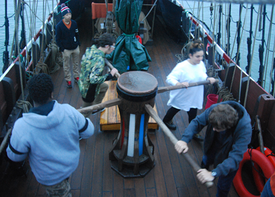 We use simple machines all over the Half Moon in a wide variety of forms and uses. For example, our capstan (pictured) is a massive winch used for tasks such as weighing anchor. The anchor alone weighs 300 lbs., plus the weight of its chain, while the total load on the capstan (including the anchor, chain, line, and the strain of pulling the ship against the current) while weighing anchor can approach a ton. Despite this, with the capstan's help, just six or eight students can raise our anchor without a problem (though certainly not without effort!).