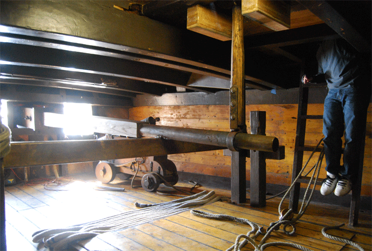 In the helm hutch, we use a whipstaff to steer the ship; the original d'Halve Maen's construction predates wide use of the ship's wheel by about a century. The whipstaff is a simple lever, allowing a single crew member to easily push the ship's massive rudder and tiller to back and forth.
