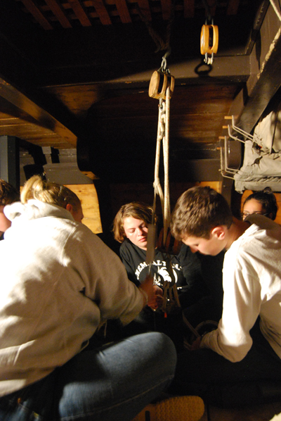 On this voyage, the research team of Cameron C., Greg, Kristen, and Liz studied mechanical advantage for their presentation project. To conduct their experiment, they rigged a block-and-tackle system designed to lift a fixed load — in this case a lead weight assembled just for this rig — a few inches off the deck, using from one to five pulleys to distribute the load. As the students haul on the line, a spring scale measures how many pounds of force they must exert to lift the weight. In addition, the students measure the length of the line they need to pull through the simple machine in order to raise the weight the same distance while using different pulley configurations.