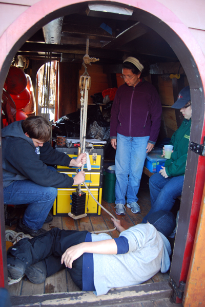 Stage Two: Data Collection: To test the principles of mechanical advantage, they teammates worked together to construct a simple machine: a block-and-tackle pulley system designed to lift a specific lead weight a set distance off the deck.