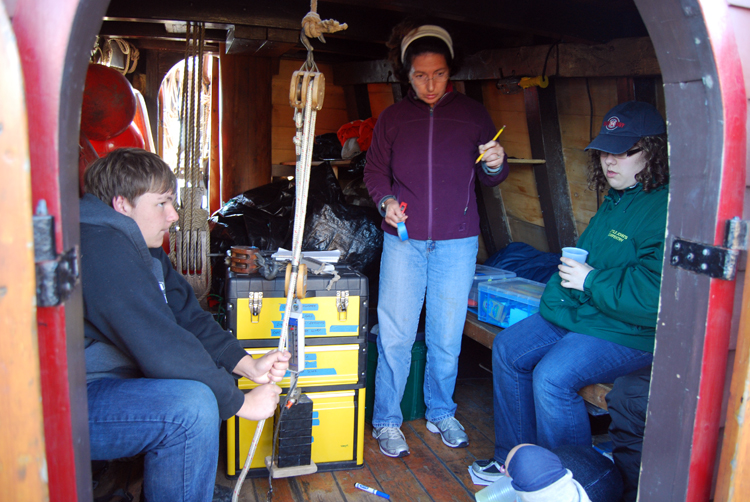 Stage Two: Data Collection: The weight and the height the weight were pulled off the deck were constants in the experiment — they didn't change. The team studied the two variables in the system: the amount of force needed to lift the weight, and the length (distance) of line that must be pulled through the machine to achieve the same results.