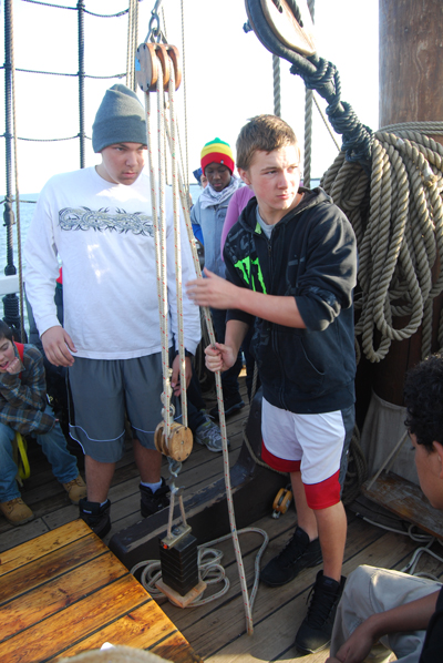 Stage Three: Presentation: The Mechanical Advantage team concluded their presentation with a practical demonstrating, assembling their rig and using it to hoist Joseph B. a few inches off the deck.