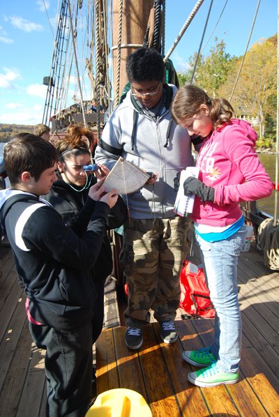 Stage Two: Data Collection: The teammates took turns using the various instruments required for the experiment. Each had a role to play; here, Andrew holds the quadrant steady, Rachael marks the sun's azimuth, Kevon marks the time, and Hannah helps Andrew align the quadrant's shadow to get an accurate reading.