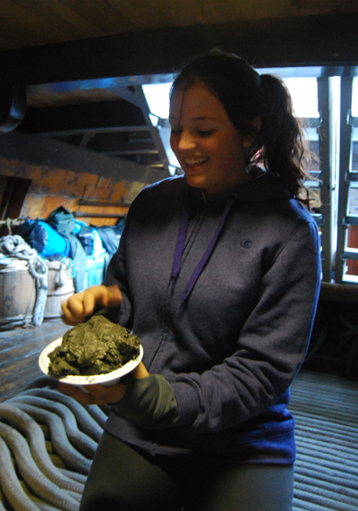 1st Entry, 0747 Hours: Evelyn checks out a sample of silt the anchor hauled up from the bottom of Newburgh Bay. We'll store it in the fo'c'stle and take a look at it under the microscope later. For now, poking it will suffice as a preliminary examination.