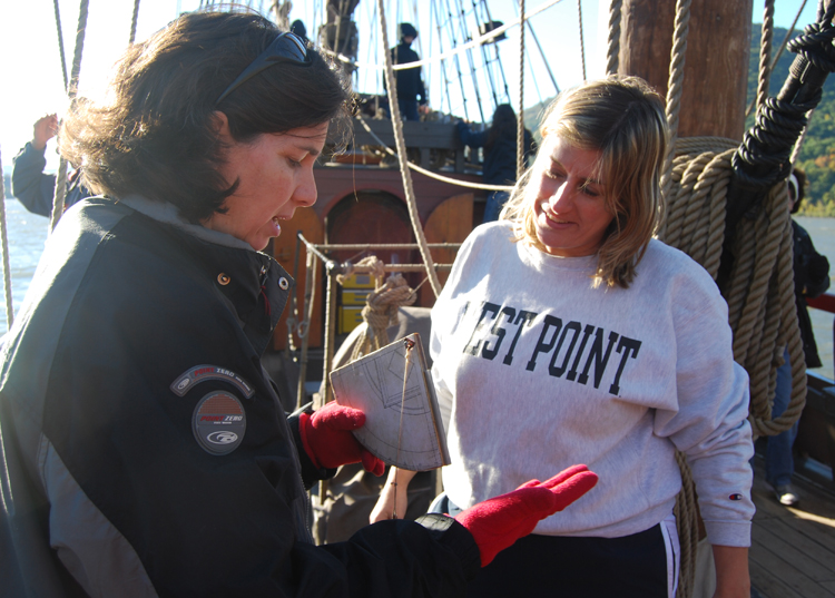 3rd Entry, 0915 Hours: As we travel through the Highlands, the Connecticut River Academy educators prepare to launch the student crew into their research projects. Here, Ms. Reilly shows Ms. Roth how to use a quadrant to measure the altitude of the sun.