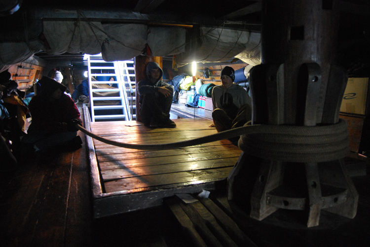 1st Entry, 0843 Hours: Of course, we are still being constructive with our time. After breakfast, the students run the anchor rode around the lower capstan, prepping for when we weigh anchor later this morning.