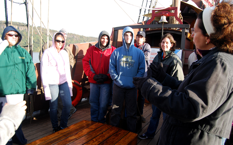 1st Entry, 0902 Hours: Before we turn to the day's journey, the Connecticut River Academy teachers gather their students around in a circle to discuss their experiences on board the ship so far.