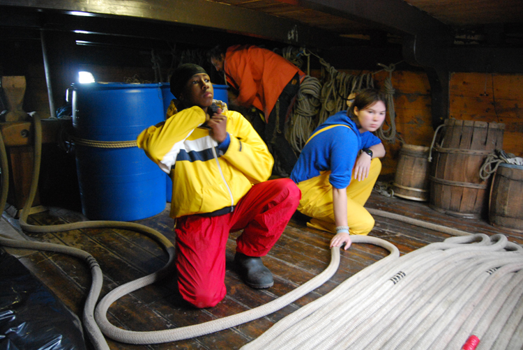 2nd Entry, 1059 Hours: Each morning, as the Half Moon gets underway, we weigh (raise) the anchor to free ourselves from the night's mooring. This is a complex process, and with this entry we'll follow through the entire procedure, step by step. First, the entire crew divides into teams spread across four decks. On the orlop deck, Timotyh and Jeannine prepare to fake (neatly fold) the anchor rode (line) after it enters the ship and passes around the capstan. Mr. Hotterstein works the bits, where the rode can be made fast; he's in postion to secure the road at a moment's notice as a safety precaution.
