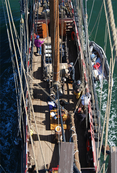 1st Entry, 1128 Hours: As the morning wraps up and the Half Moon slices through the foaming seawater of the Sound, our crew members are all busy at one project or another, be it training with the sails, collecting data, or climbing aloft.
