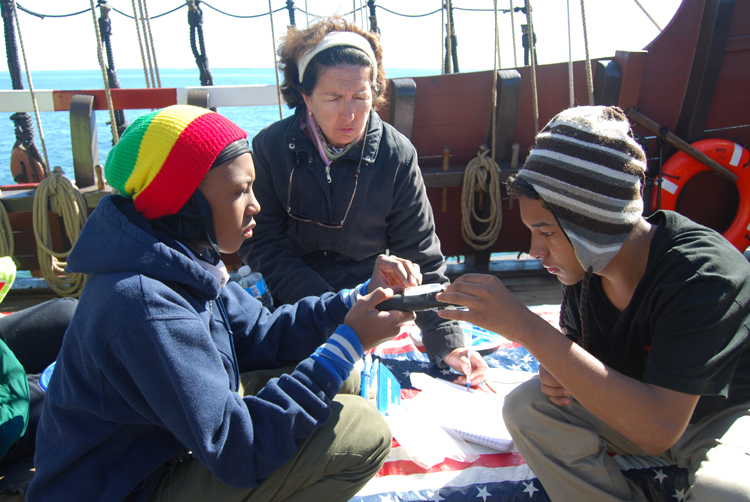 2nd Entry, 1341 Hours: The students' research into salinity and turbidity is ongoing as well. Once celestial tracking is no longer occupying the lion's share of their time, Timothy and Zack take the lead in using a refractometer to analyze the water samples they've been collecting since Newburgh Bay.