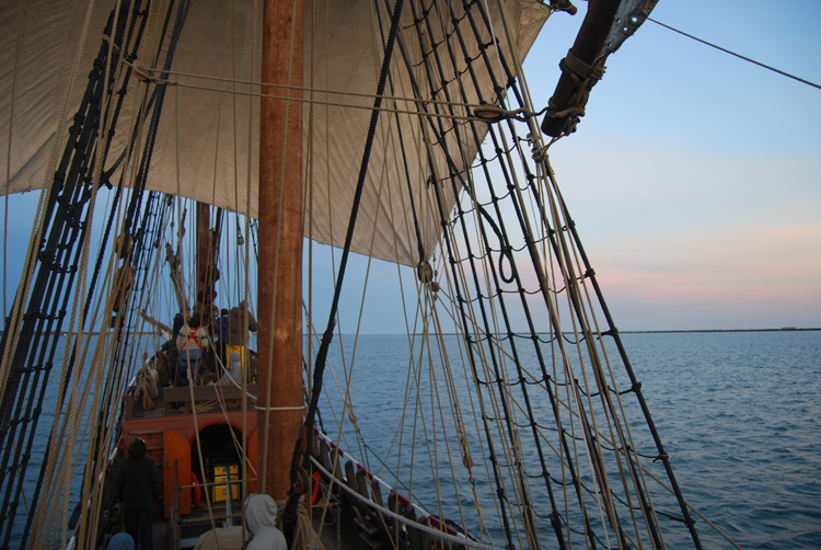 4th Entry, 1832 Hours: Under reduced sail power, we enter the harbor and maneuver into position.