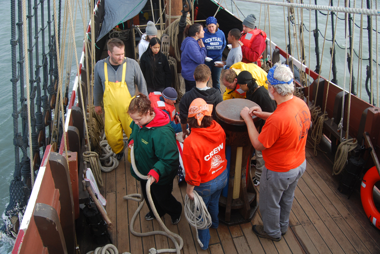 2nd Entry, 0852 Hours: As the Half Moon heads inland toward New Haven, some crew members ready the docking lines while others dig into a light breakfast.