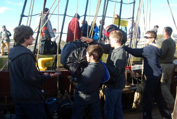 1st Entry, 0953 Hours: Once half of the students are on board, the crew works together to relay everyone's gear onto the ship and from there down to the orlop deck.