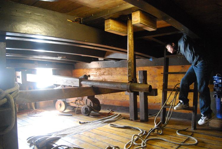 2nd Entry, 1145 Hours: As we ready our departure, Andrew is assigned as the Line Four communicator, relaying messages to the crew member handling the stern dockline. His station also gives us a chance to look at the ship's steering device, the whipstaff, where it connects to the tiller.
