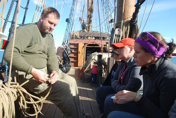 3rd Entry, 1515 Hours: Orientation continues throughout the day. Back on the weather deck, Mr. Burmester shows how ropes are woven from smaller strands while discussing line handling techniques with Liz, Ms. Pac, and Ms. Falvey.