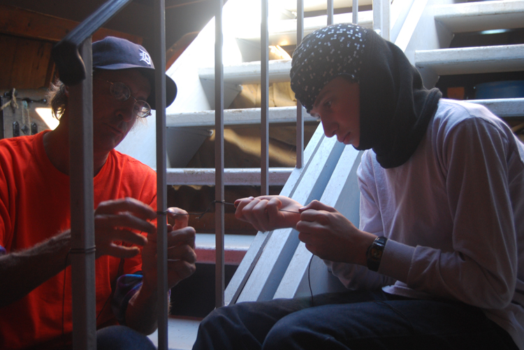 3rd Entry, 1512 Hours: Back down on the orlop stairs, Mr. Hottenstein is teaching Cameron C. some advanced ropework called siezing, a secure method of binding.