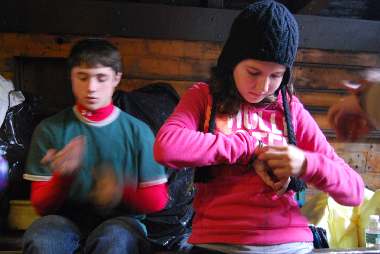 1st Entry, 1216 Hours: As morning turns to afternoon, the students continue practicing their shipcraft. By now, Andrew and Hannah have progressed past basic knots to try our their first marlinspike projects.