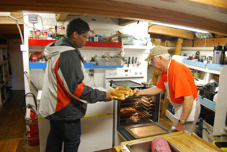 1st Entry, 1228 Hours: Regular ship's duties continue during our layover, of course. In the galley, Kevon works with the Fourniers to prepare and serve lunch.