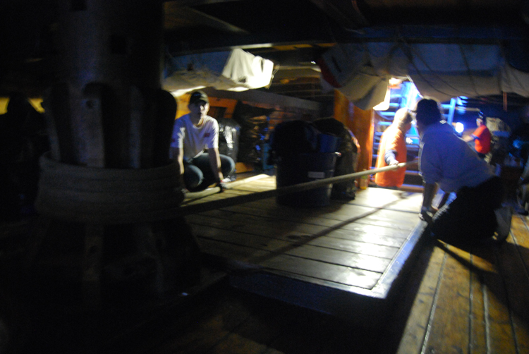 1st Entry, 0735 Hours: Well aft of the fakers, Cameron S. and Kristen control the rode as it twists around the lower capstan, with Mr. Woodworth overseeing. Their job is to keep a close eye on the rode as it coils around the capstan, preventing overrides (tangles).