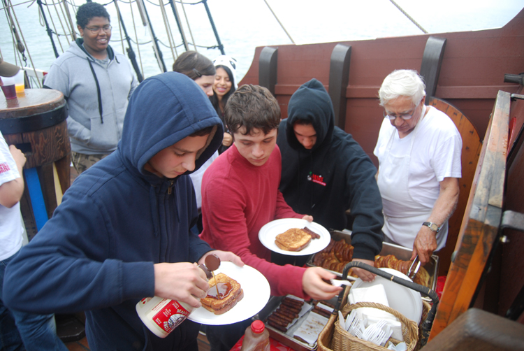 2nd Entry, 0836 Hours: In the meantime, however, let's eat! Mr. Fournier serves French toast and sausage on the weather deck.