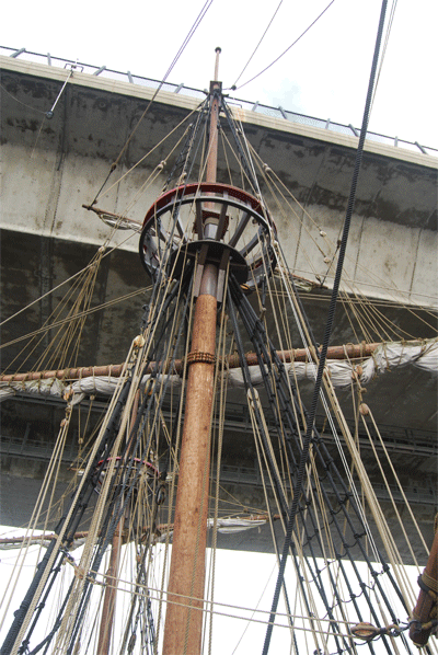 3rd Entry, 1040 Hours: That's one bridge down, but we aren't in the clear yet. Just past the railroad bridge is the towering I-95 bridge. With the Connecticut River's fluctuating water levels, the Half Moon's ability to clear the bridge with its top masts raised always comes down to a matter of feet.