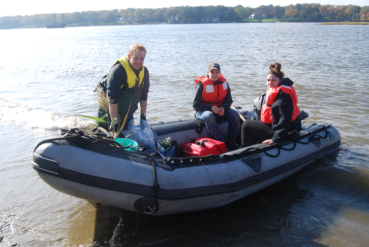 3rd Entry, 1122 Hours: Only after the Half Moon has cleared the two bridges can we consider ourselves to have truly entered the Connecticut River. With the ship now officially inland, Mr. Shorthouse zips ahead on an away mission with members of the Salinity team. The students quickly check out the salt marshes at the river's mouth, collecting plant and soil samples to analyze back on the ship.