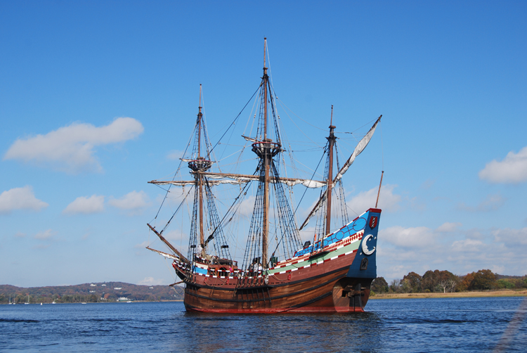 4th Entry, 1131 Hours: Compared to the Half Moon's homewaters back on the Hudson River, the Connecticut River has always been narrow and tricky to navigate for large craft. On the one hand, this has historically limited the commercial traffic on the Connecticut River, leaving most of its shoreline lightly populated countryside, unlike the more industrialized Hudson. On the other hand, this means we rarely have an opportunity to sail on this river; the wind must be just right.
